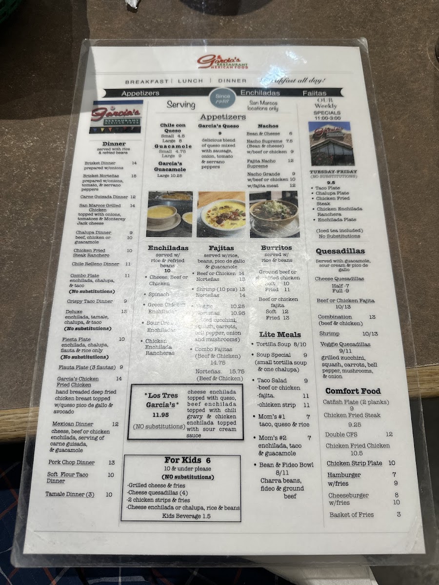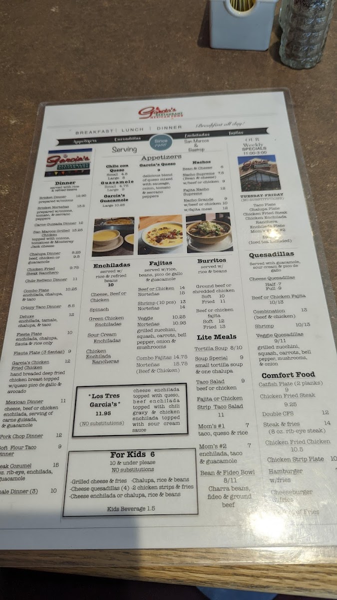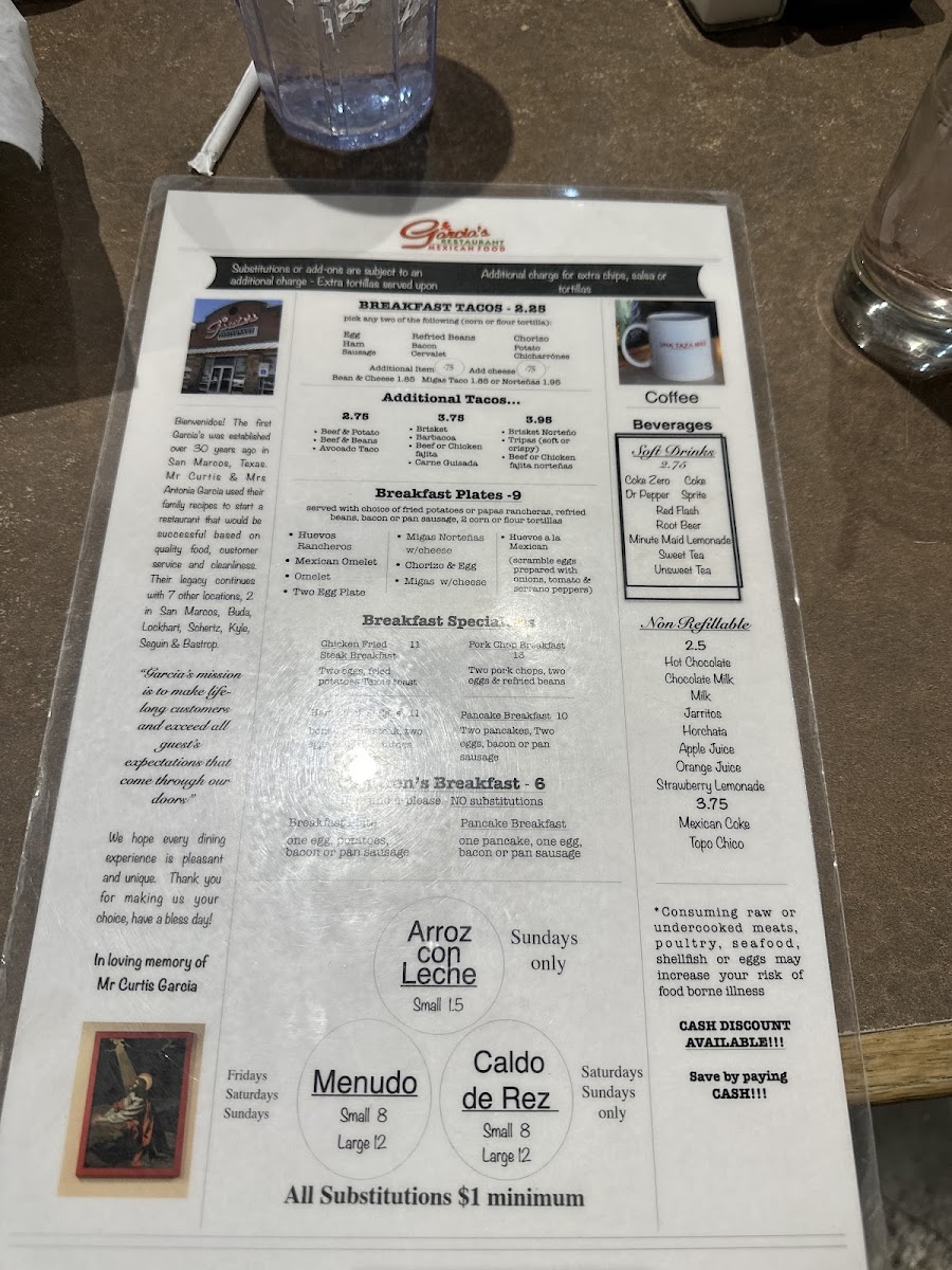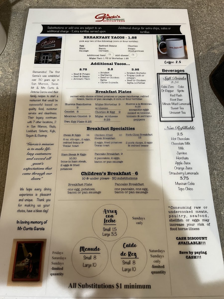 Welcome to Garcia's, a culinary gem nestled in San Marcos, Texas, where vibrant flavors meet hometown hospitality. Their menu is a celebration of traditional Mexican cuisine, featuring crowd favorites such as tacos, barbacoa, and delightful quesadillas stuffed with tender meats and rich cheeses. Each dish is crafted with care, showcasing bold flavors that keep diners coming back for more.